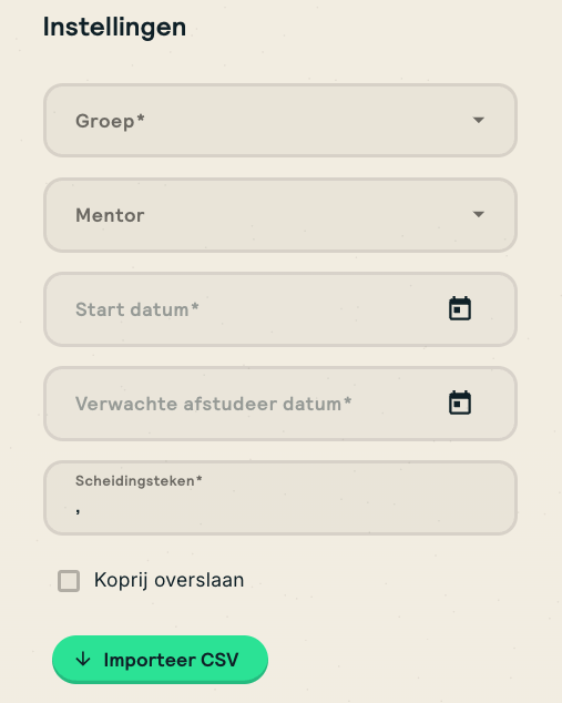 Als je een grote groep studenten moet aanmaken, is het omslachtig om dit elke keer via het formulier te moeten doen. Daarom is er de functionaliteit om gebruik te maken van CSV-export.