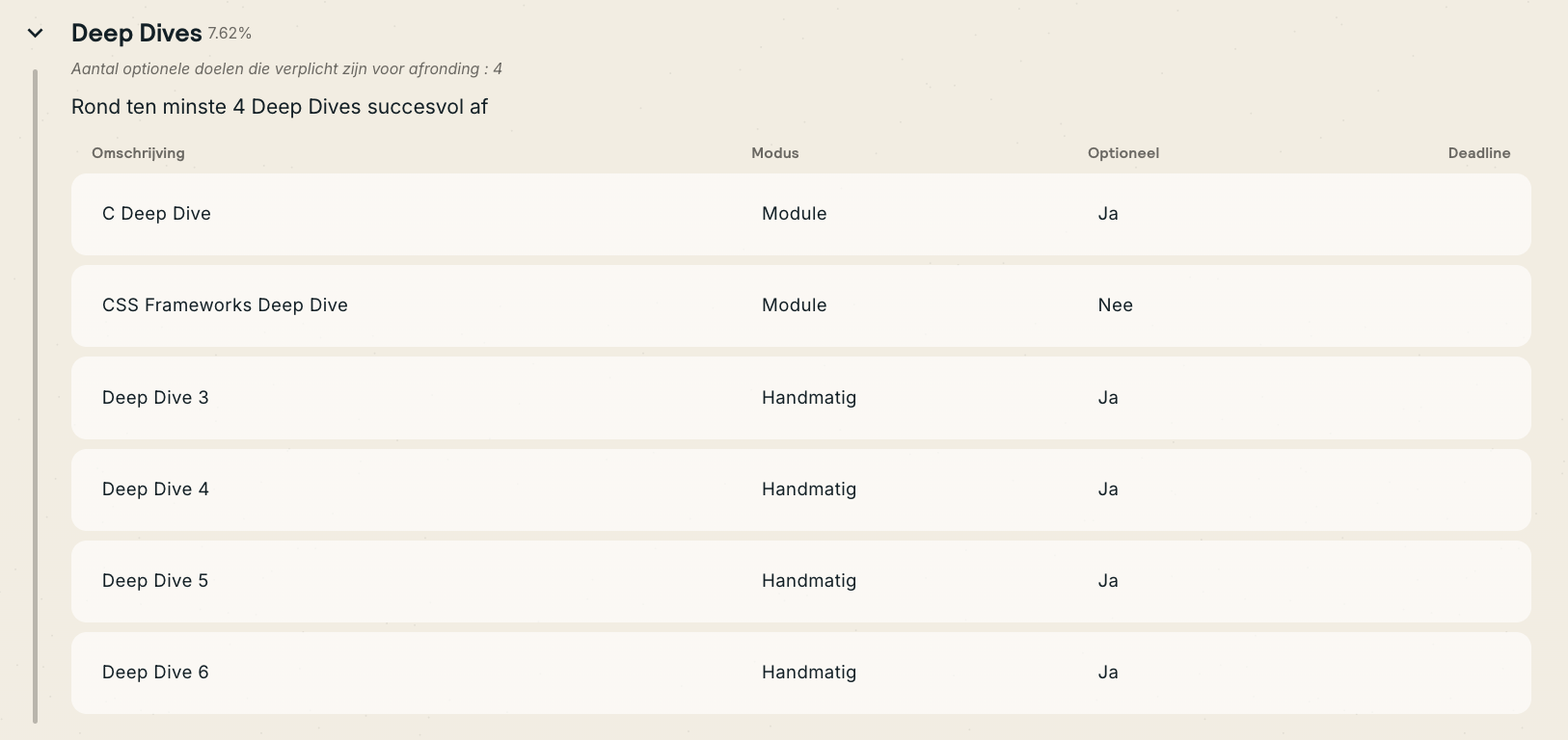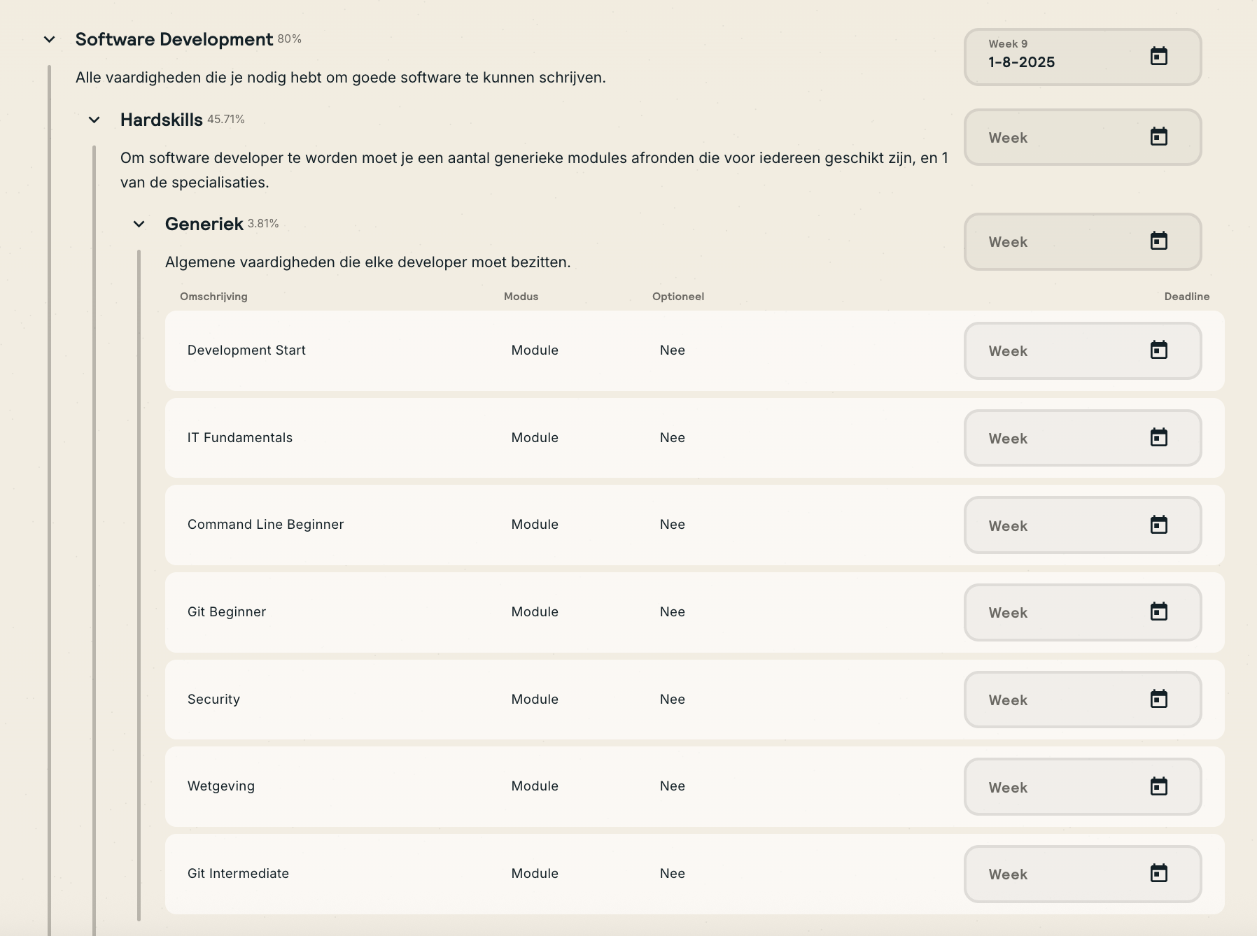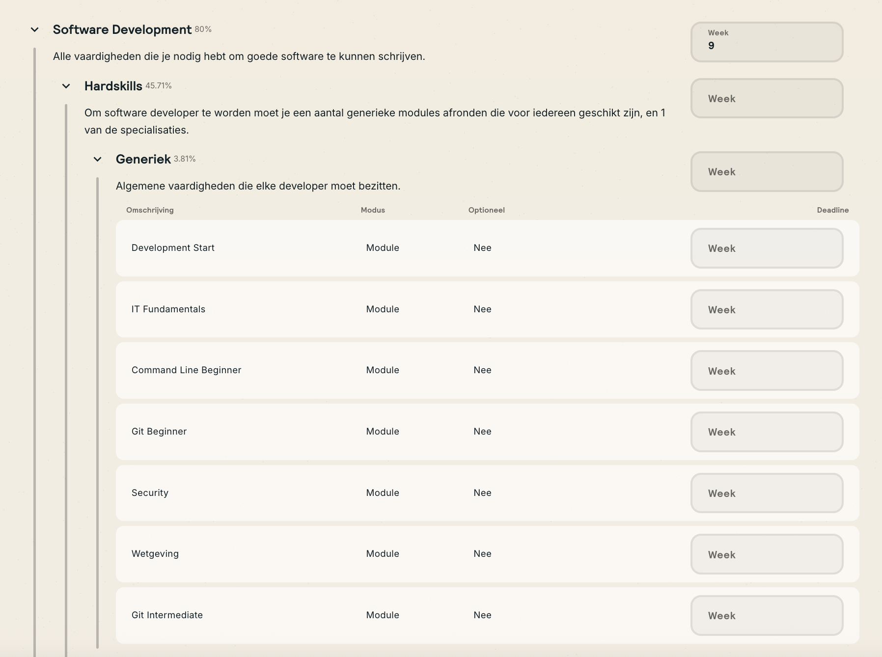 Elk doel in het competentieprofiel heeft vervolgens een wekelijkse deadline dat op basis van de startdatum van de student wordt berekend.