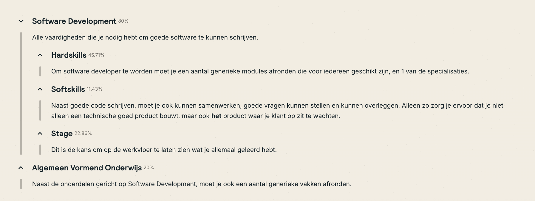 Algemene vakkendoelstelling krijgt de student 50% voortgang. Eén van de twee doelstellingen (Software developmentenAlgemene vakken) is namelijk afgerond. - Voor het afronden van de
