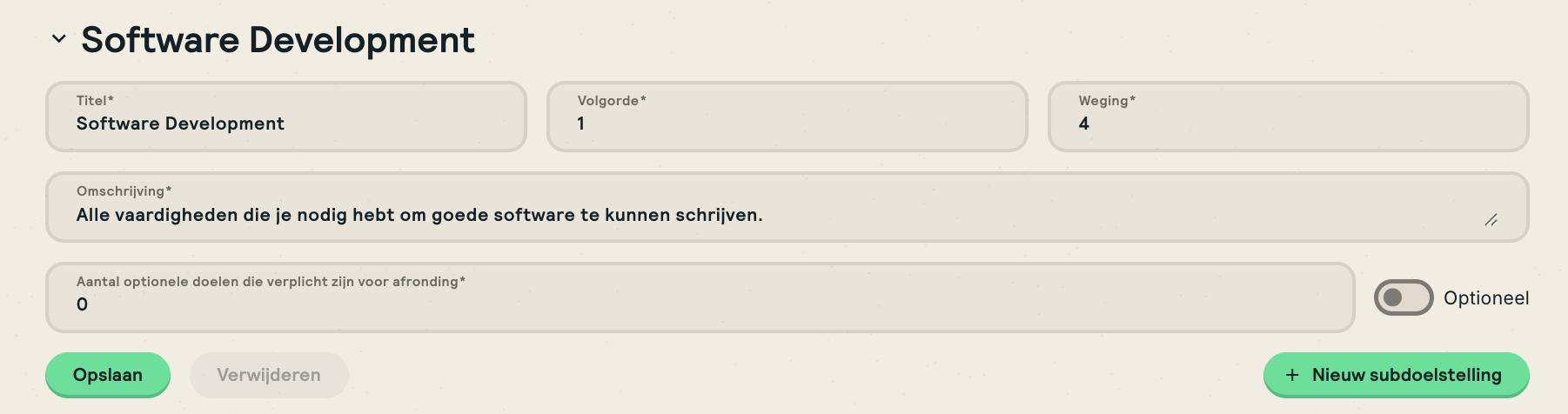 Aantal optionele doelen die verplicht zijn voor afronding: Als deze doelstelling optionele doelen bevat, kun je aangeven of hiervan een minimum aantal afgerond moet worden. -