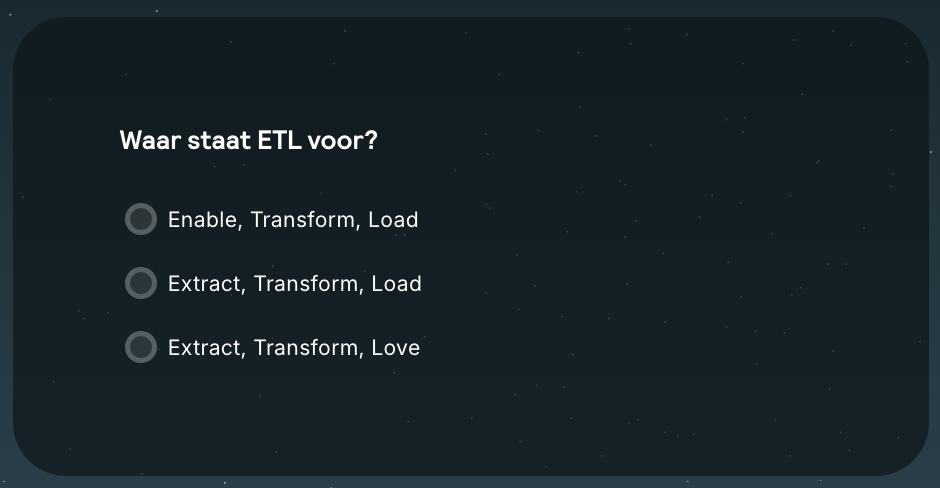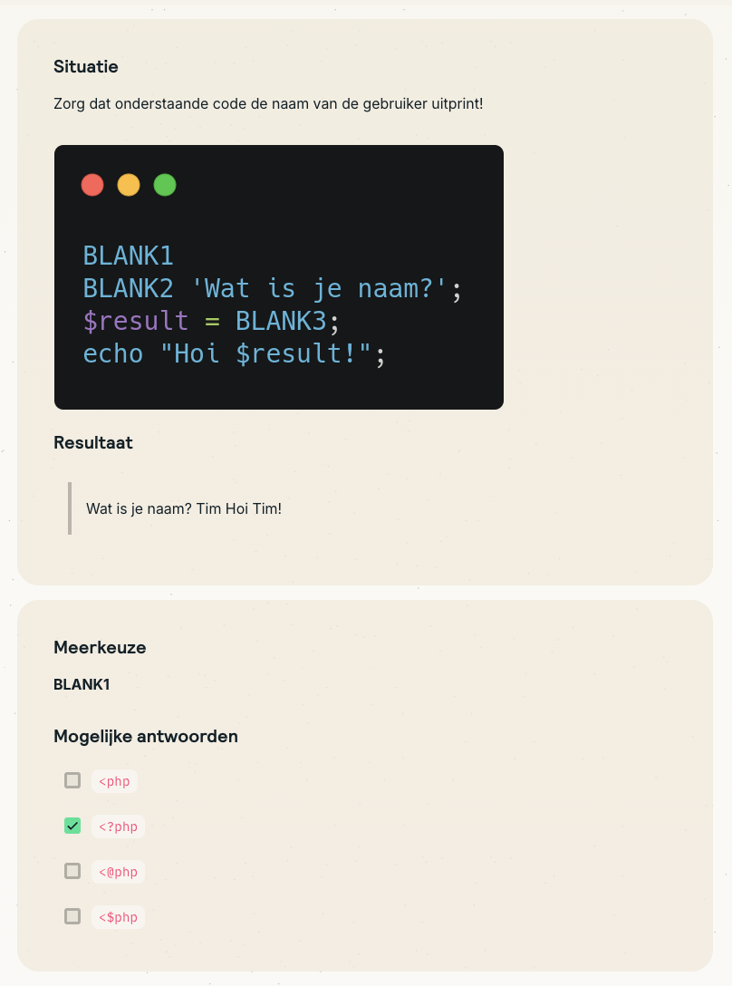 Je zoekt het correcte antwoord bij een vraag. De vraag kan over een situatieschets staan zoals het voorbeeld hierboven, of de vraag staat op zichzelf.