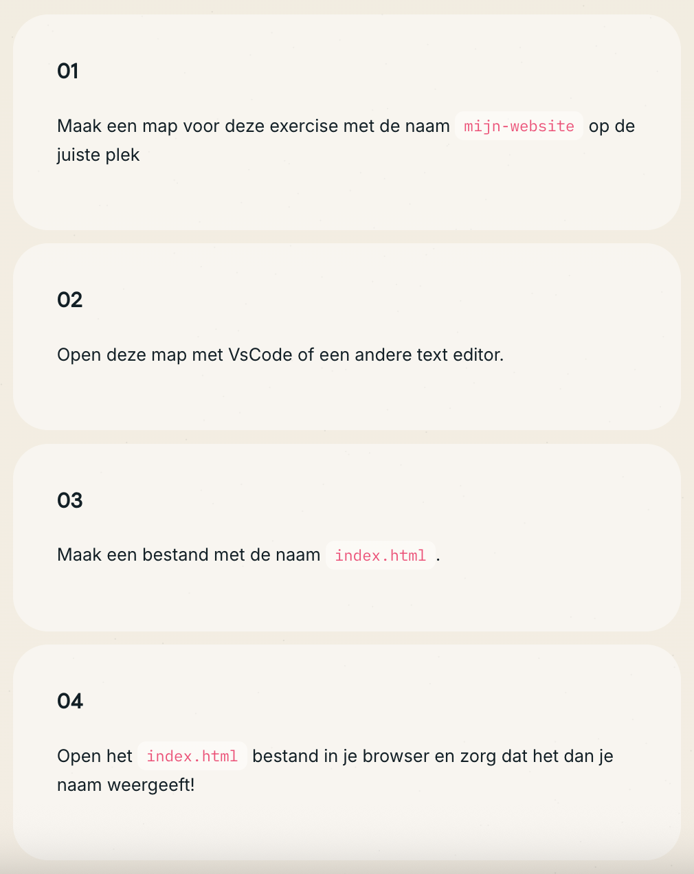 Bij praktijk exercises staat in de omschrijving welke stappen je gaat doorlopen. Deze stappen zouden je naar de verwachte uitkomst moeten leiden. De stappen staan altijd toegelicht in een zogeheten steps blok. (1)