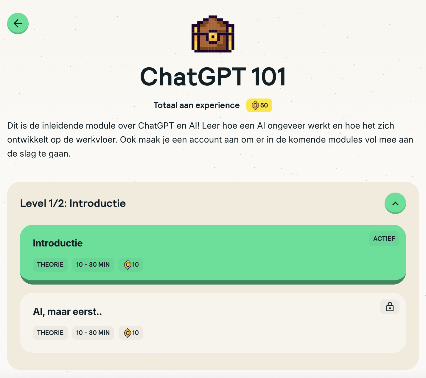 Nadat je bent ingeschreven voor een module, kom je in het Moduledetailscherm. Hier zie je een overzicht van de levels en exercises binnen de module. Zoals op onderstaande afbeelding is te zien, is de eerste exercise in de module automatisch beschikbaar.