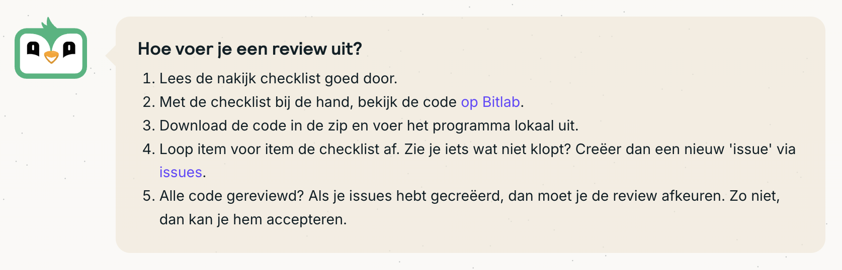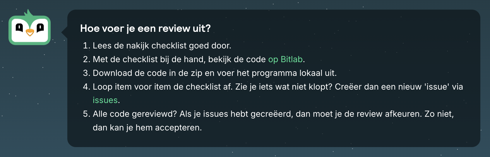 Heeft verbetering nodigen maak een issue aan in Bitlab. - In de issue leg je duidelijk uit aan de ander wat er niet goed is en wat hij/zij moet verbeteren.