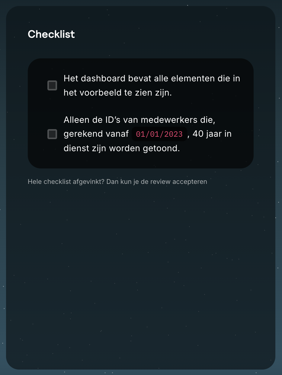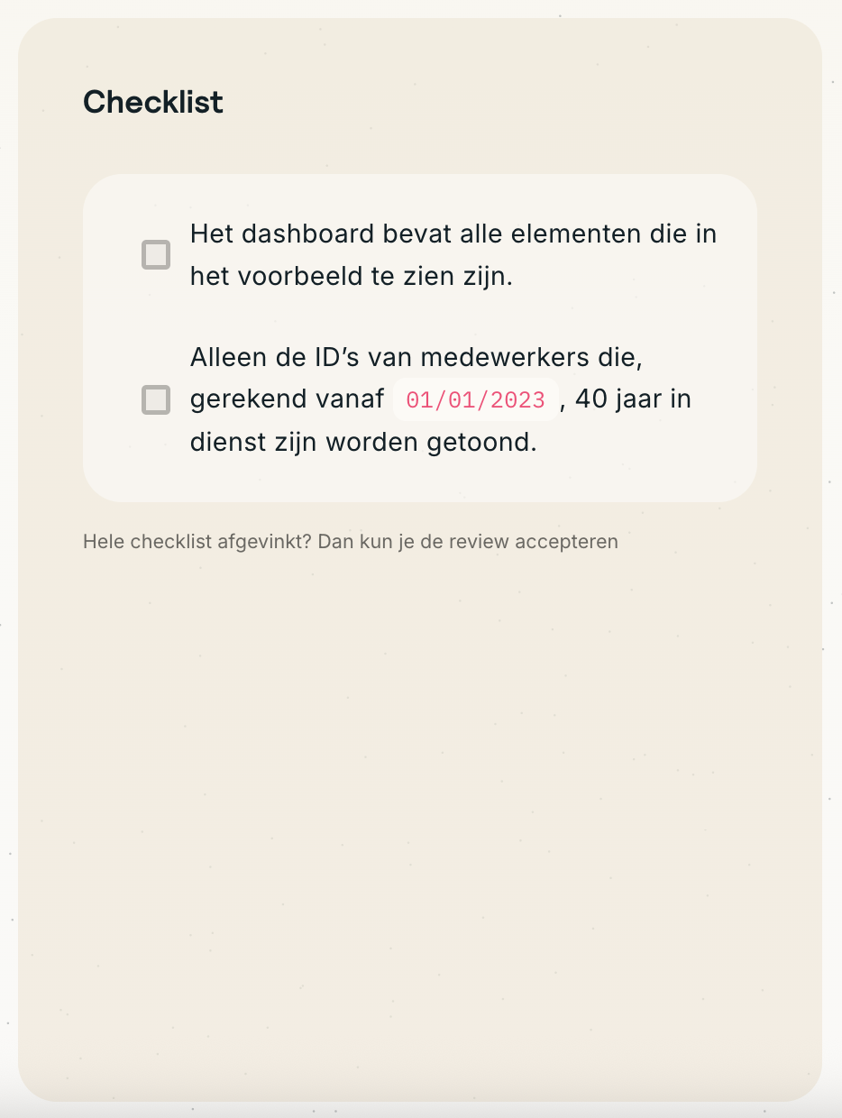 De review checklist dient als leidraad om te weten waar je op moet letten. Doorloop de checklist om te zien of de andere student de exercise goed heeft gedaan. Je kunt elk item individueel afvinken terwijl je bezig bent.