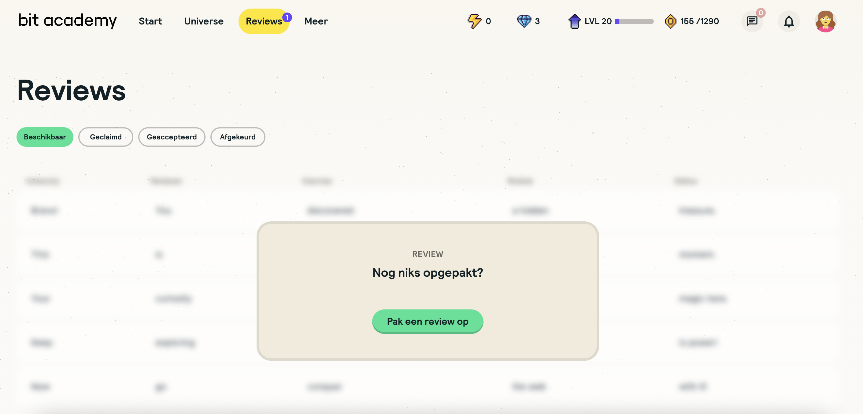 Naast het opdoen van kennis, krijg je na het uitvoeren van een review ook nog een andere beloning: Je krijgt 1 gem per review. Je krijgt deze gem ongeacht of de uitkomst van de review positief of negatief is.