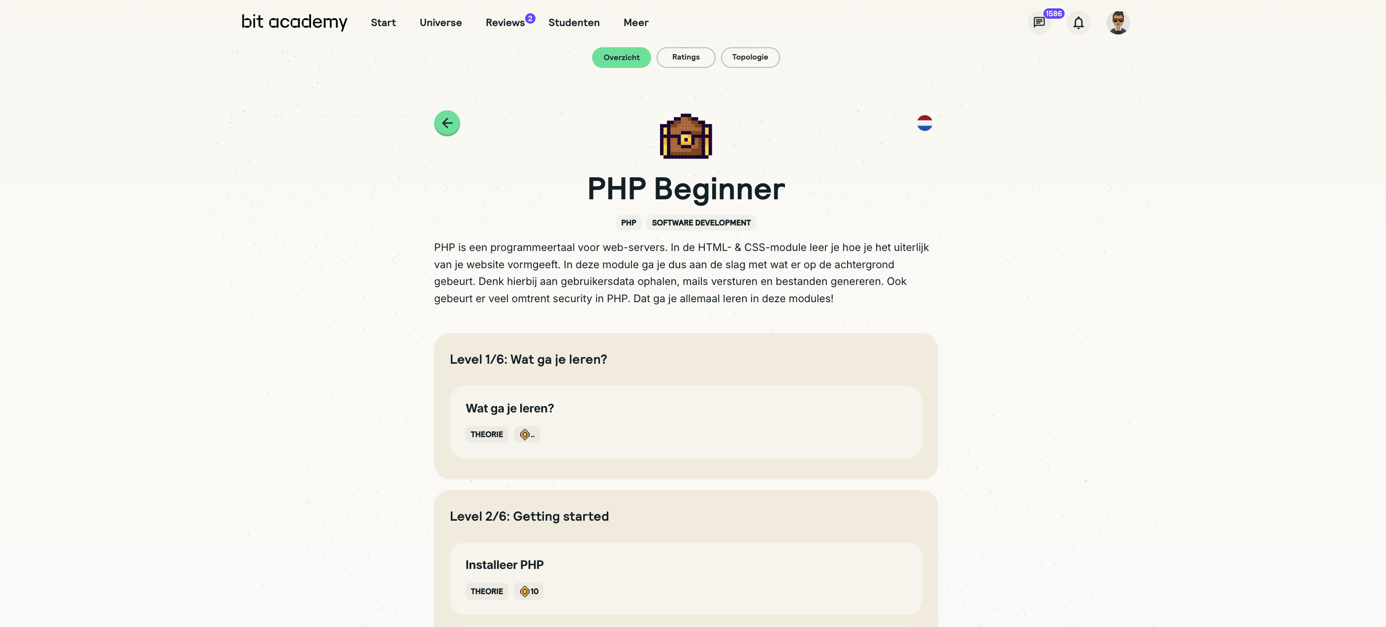 We zijn nu aangekomen in een module. Een module bestaat uit één of meerdere levels. Elk level heeft vervolgens weer één of meerdere exercises. Exercises zijn de opdrachten die studenten moeten maken.
