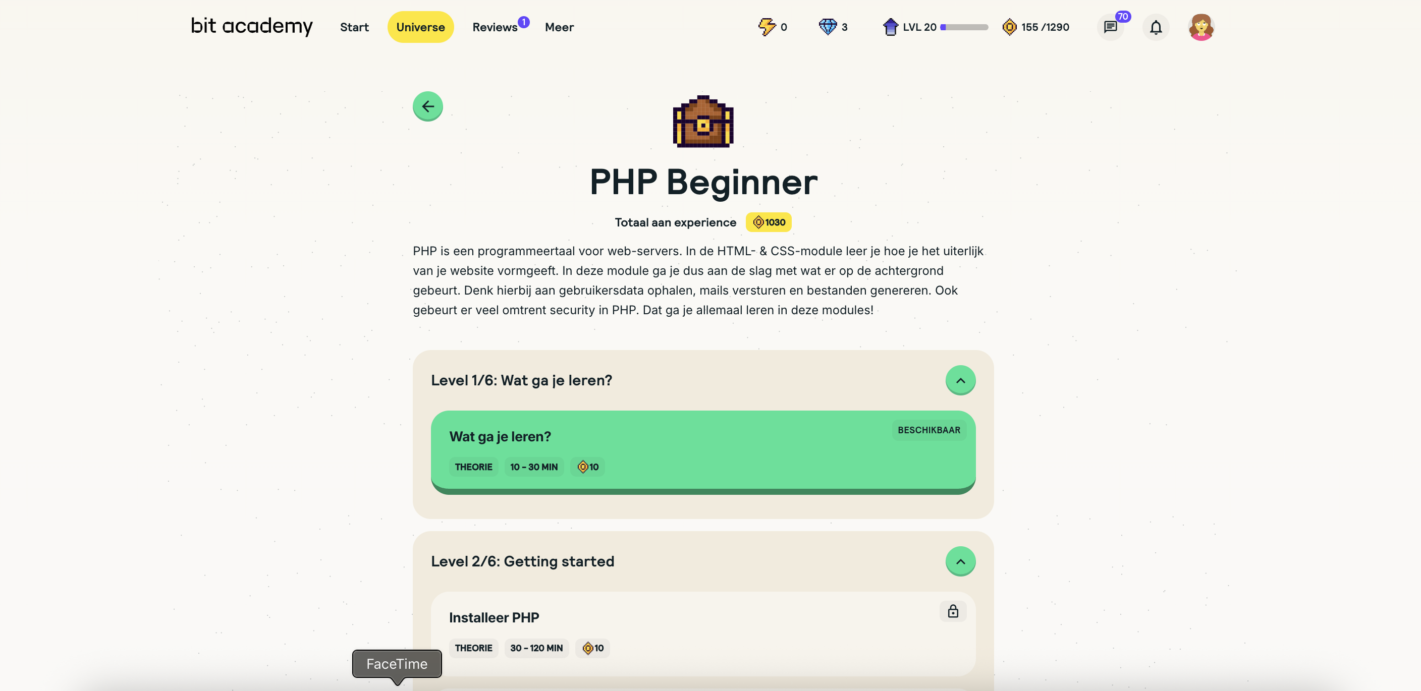 Levels bestaan vooral uit theorie en praktijk exercises. (1) Bij theorie exercises hoeft de student alleen de stof door te lezen, terwijl ze bij praktijk exercises ook iets moeten inleveren. Dit kan zijn: