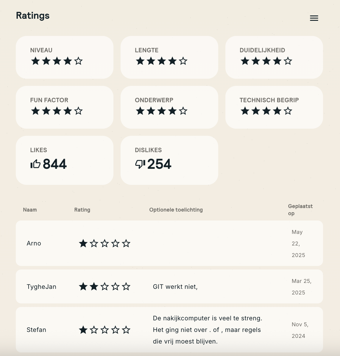 Nadat je een module hebt opengezet, kunnen studenten beoordelingen achterlaten voor iedere exercise. (1) Deze kun je bekijken via het tabblad Ratings van een exercise: