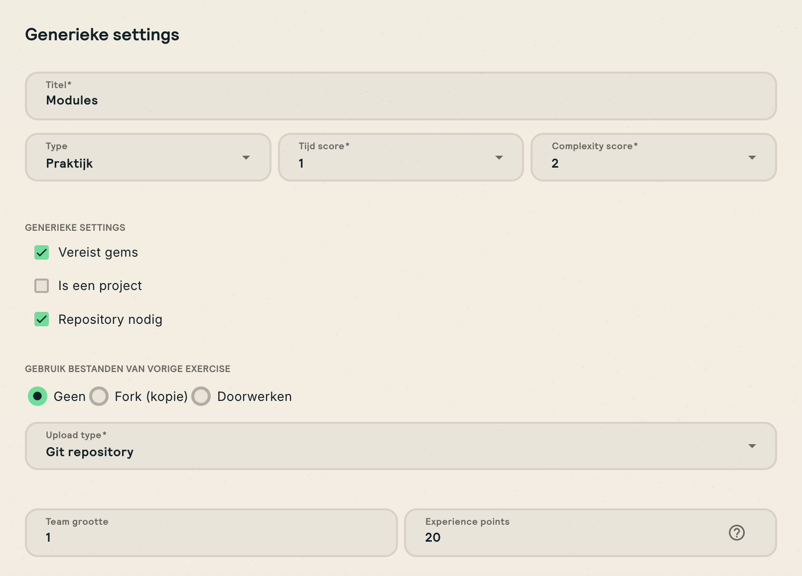 Upload type: Geeft aan of de student een lokaal bestand moet inleveren, of dat het via Git ingeleverd moet worden.