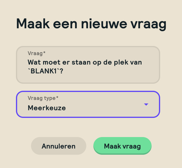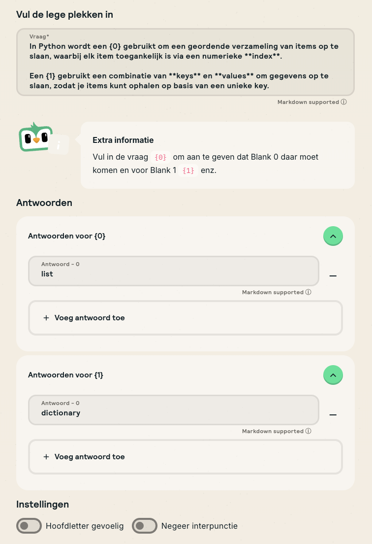 Voeg antwoord toeom voor elke lege plek het correcte antwoord toe te voegen. - Druk op om een antwoordoptie te verwijderen.