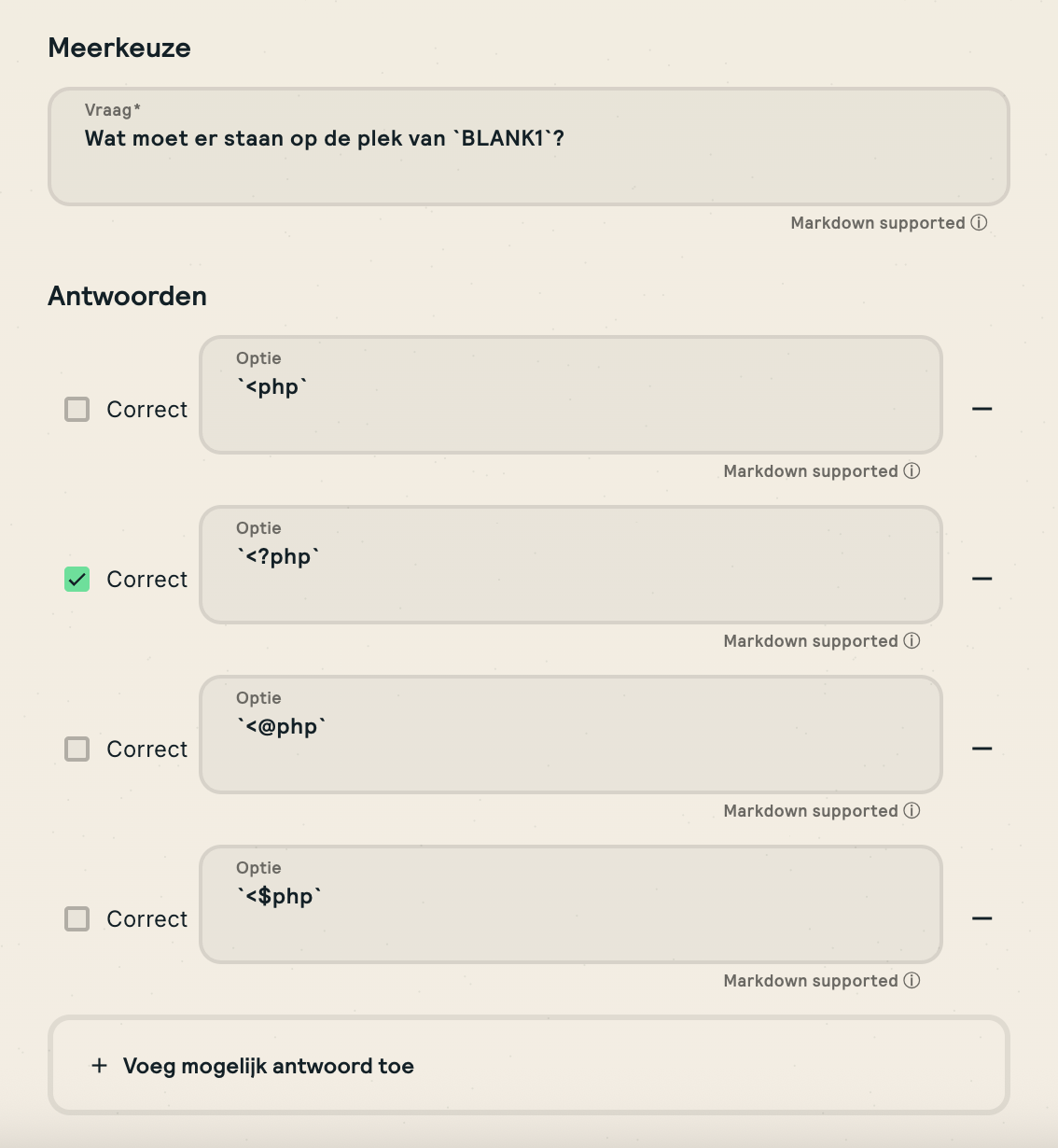 Voeg mogelijk antwoord toeom een nieuwe antwoordoptie toe te voegen. - Vink aan om een correct antwoord te markeren.