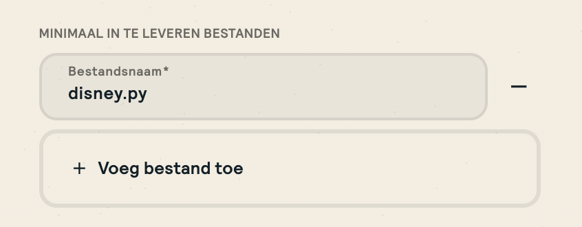 In het bovenstaande voorbeeld moeten studenten dus een bestand genaamd disney.py inleveren. Met de extensie .py geef je aan dat dit een Pythonbestand moet zijn. Wil je bijvoorbeeld dat studenten een PDF inleveren? Dan gebruik je de .pdf-extensie.