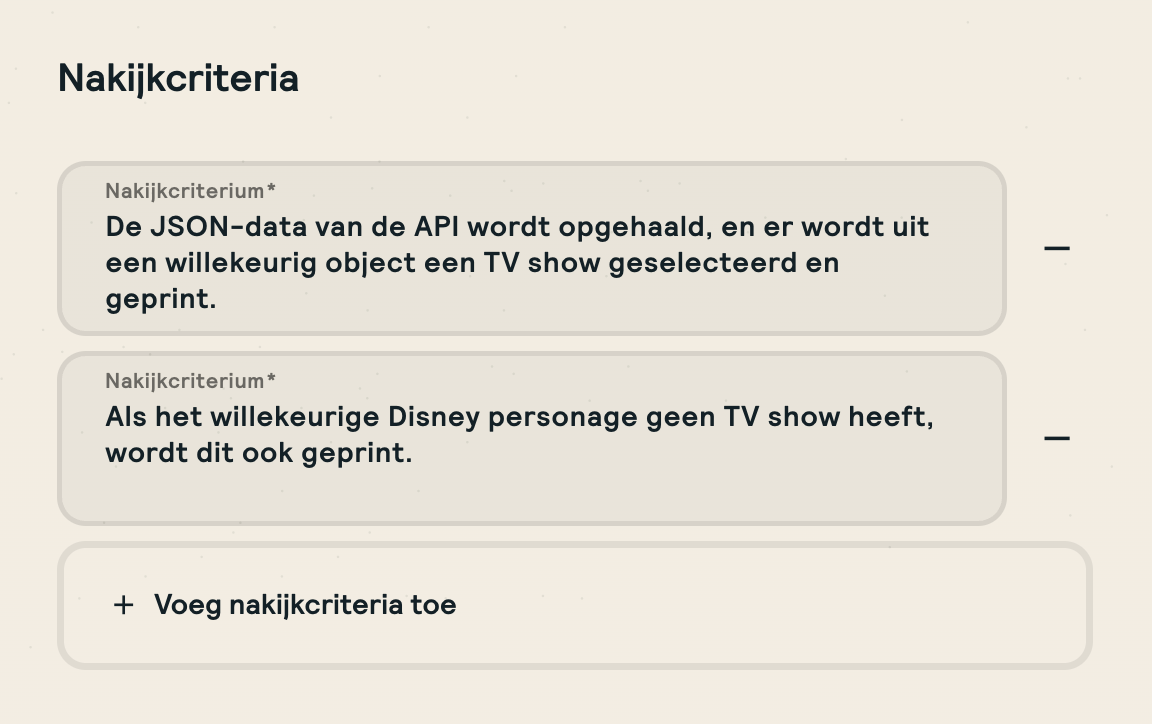 Deze sectie is voor het aanmaken van de nakijkcriteria. Met de knop Voeg nakijkcriteria toe de editor voeg je een nieuw criterium toe.