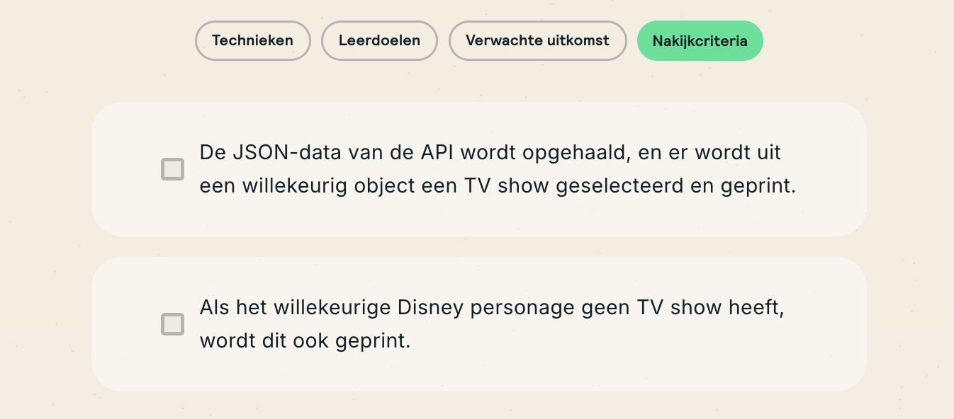 Bij het reviewen worden de nakijkcriteria een checklist waar de student aan moet voldaan hebben.