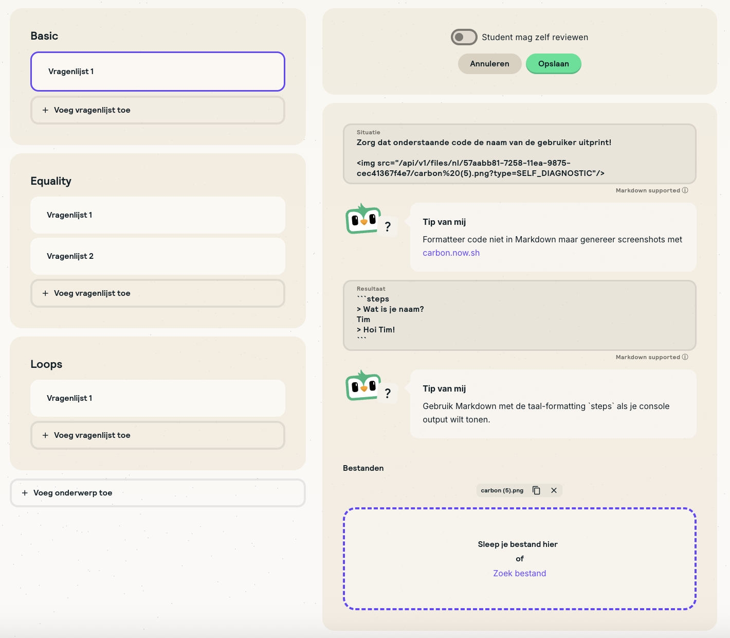- Reviewen: Als de student de exercise heeft afgerond, hoe gaat deze nagekeken worden?
