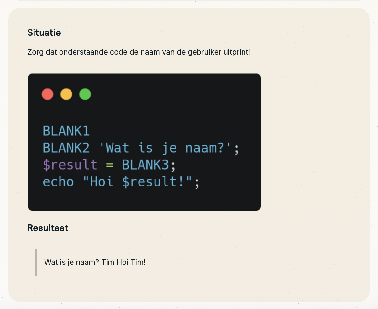 Situatie: In dit tekstvak beschrijf je de situatie voor je vragen. In het voorbeeld is dit een codesnippet (1) waar de student de lege plekken (BLANK) moet invullen. -