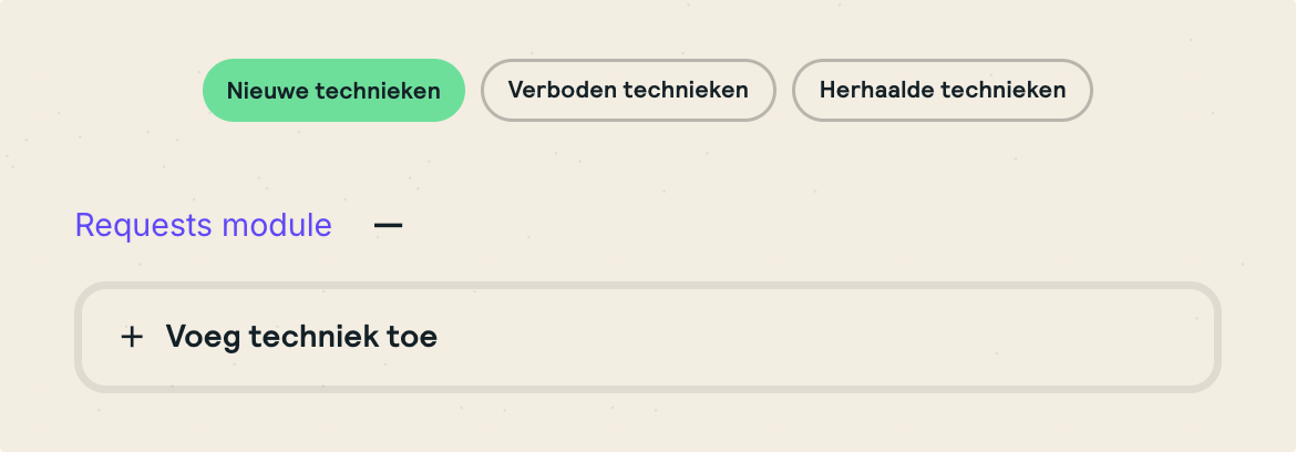 Met deze sectie kun je doorlinken naar externe bronnen over nieuwe, herhaalde of verboden technieken die in de exercise voorkomen. Deze worden dan zichtbaar voor de student als techniekblokken: