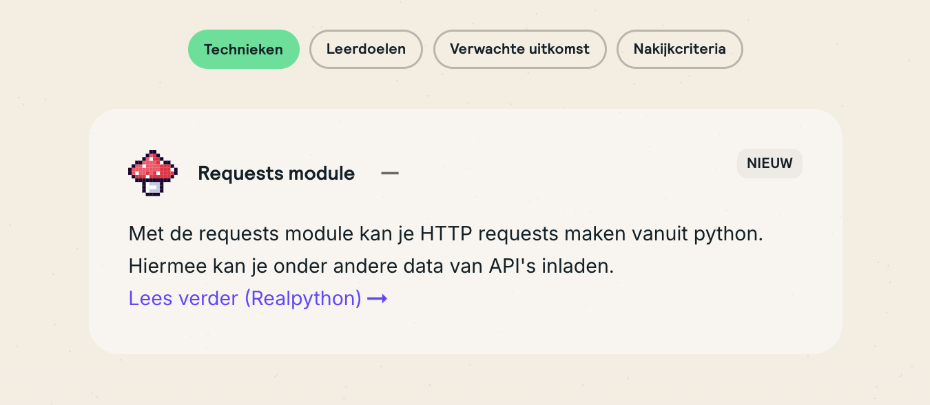 Herhaalde technieken: Gebruik dit techniekblok voor onderwerpen waar de student al bekend mee is. De student kan eventueel de externe bron bezoeken als opfrisser.