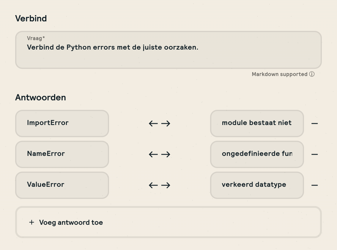 Voeg antwoord toeom een nieuwe antwoordoptie toe te voegen. - Verbind de correcte antwoorden met elkaar. Voor de studenten worden de opties willekeurig gehusseld.