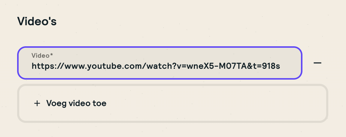 In dit vlak kun je URL's naar YouTube video's plakken. Deze kunnen studenten dan binnen het platform van NexEd bekijken. Door op Voeg video toe te klikken kun je meerdere URL's plakken.