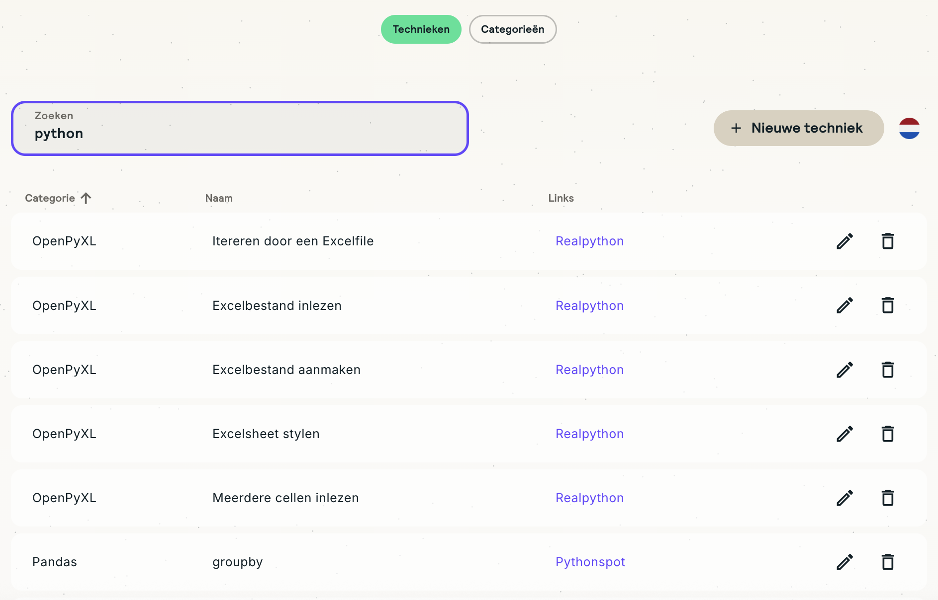 - Gebruik de zoekbalk om te zoeken naar technieken of categorieën.