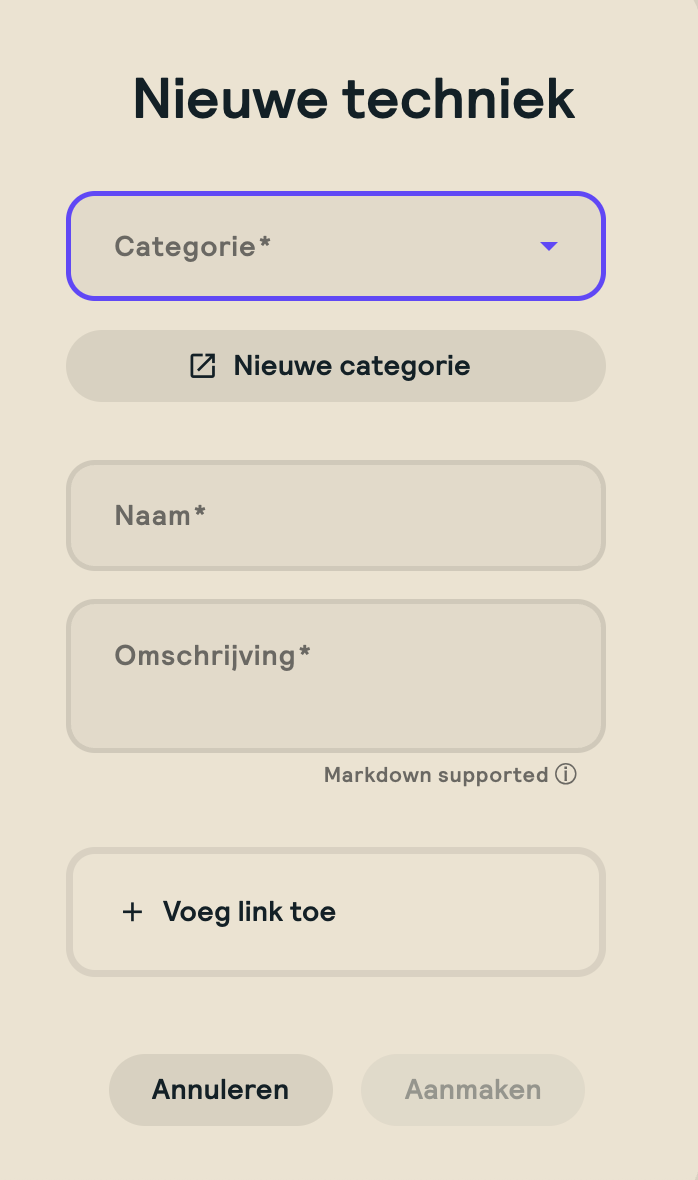 Je kunt via de de knop Nieuwe techniek zelf een techniek creëren. Je komt vervolgens in het venster terecht waarin je jouw techniek kunt aanmaken: