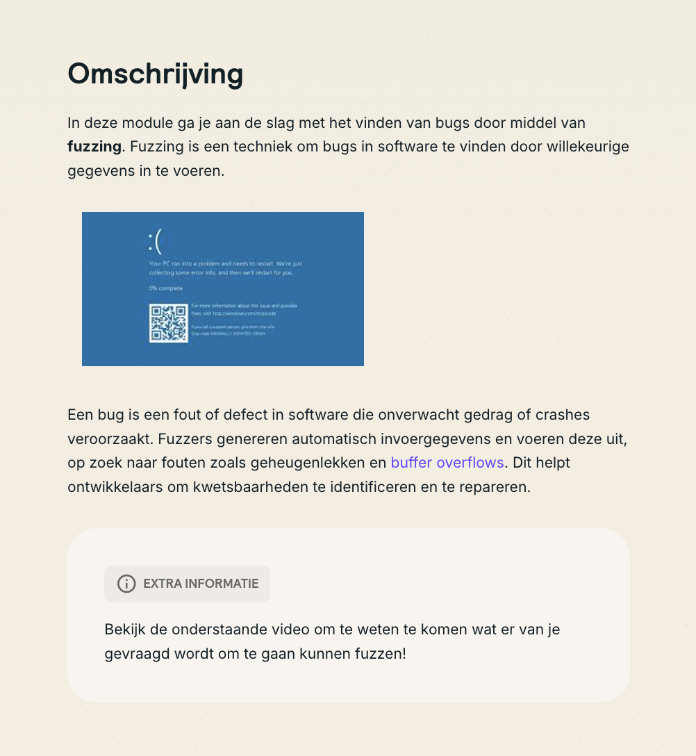 Beschrijft een nieuw stuk theorie waarmee je in de volgende exercises mee gaat oefenen. Dit kan uitgebreid behandeld worden in de omschrijving, of de student kan doorverwezen worden naar een externe bron.